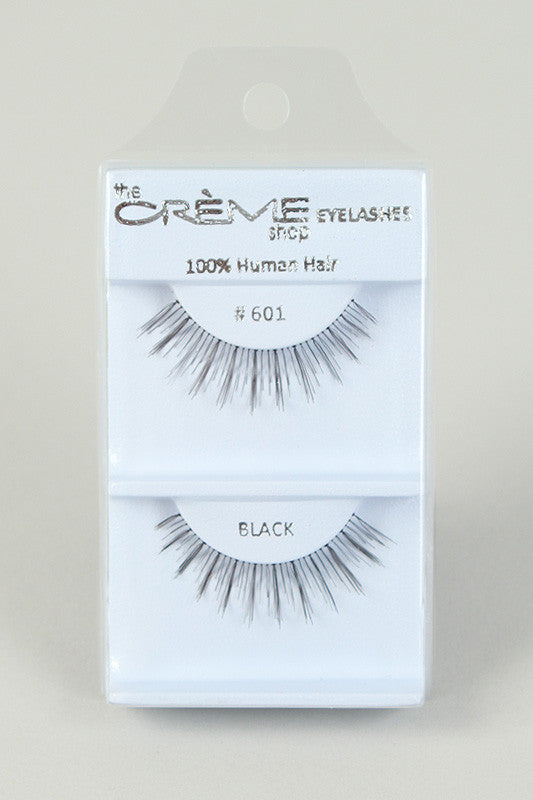 Cr�me model 601 Eyelashes features thin, 100% human hair lashes, and shorter length lashes staggered throughout. Adhesive not included.