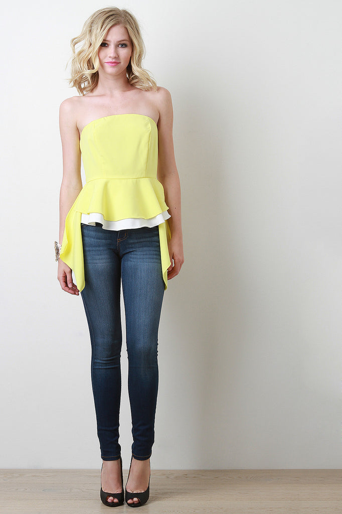 Description This unique top features a strapless style, straight elastic neckline, flowy double layer midriff, coattail style back with a slit, and rear zipper closure. Accessories sold separately. 100% Polyester.