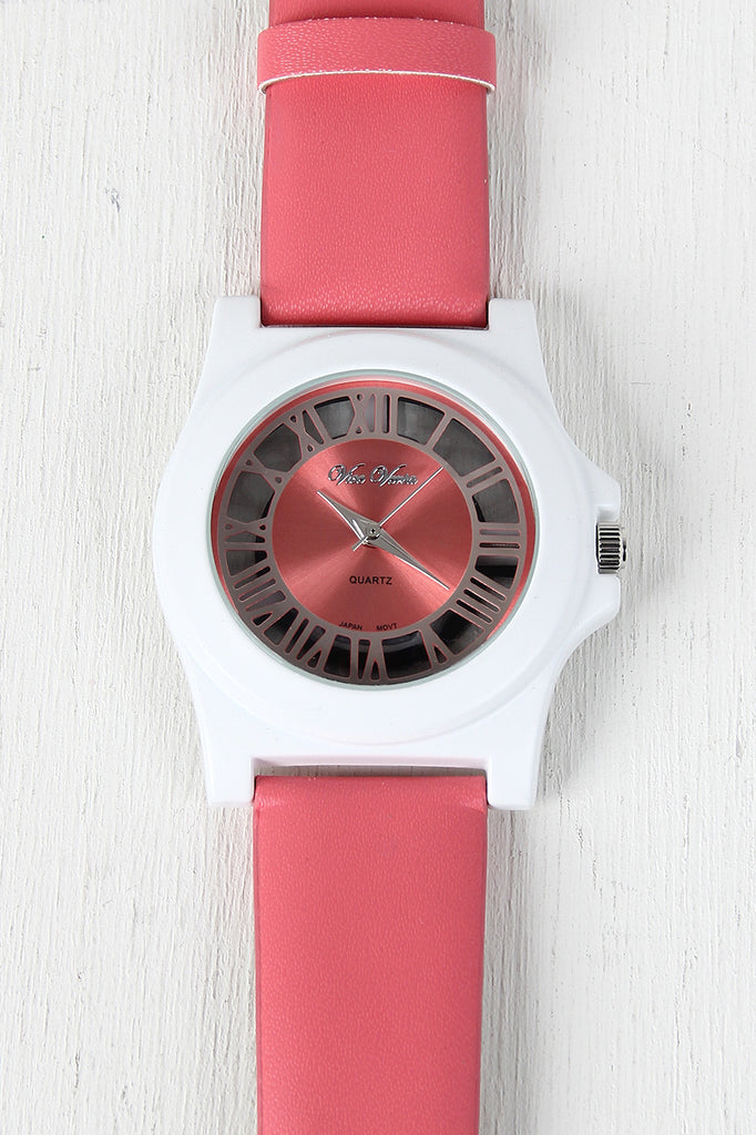 This unique watch features a partially transparent face with Roman numeral hour markings, matte bezel, and leatherette straps. Finished with two keepers and adjustable buckle closure.