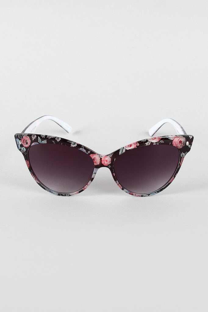 These cat eye shape sunglasses feature a semi-transparent floral plastic frame, metallic temple accents, and slightly gradient lenses.