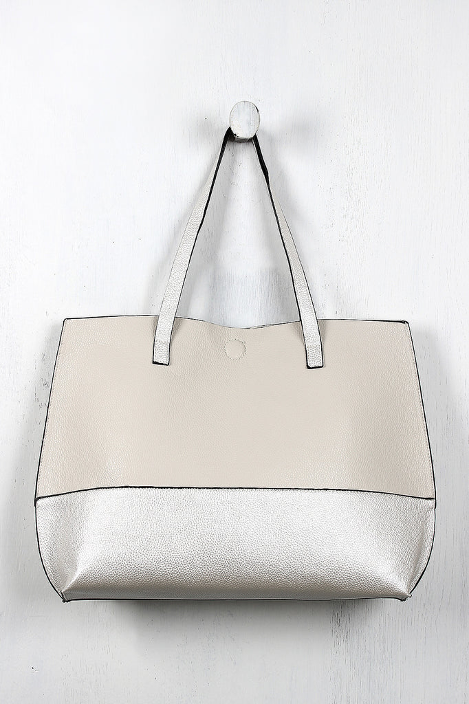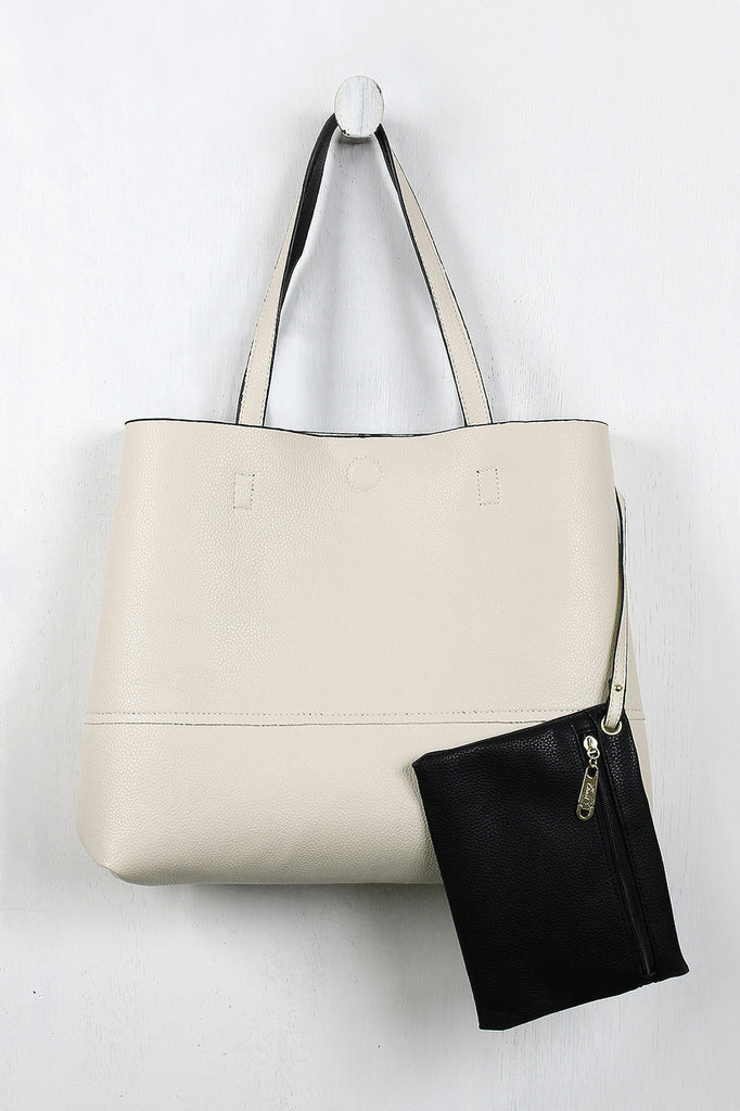 Description This pebbled leatherette tote bag features a two-tone color block design one side, solid color on the reverse, and black piping detail. The wide top has a single magnet closure and the solid color side of the bag has an attached zippered pouch. The two flat shoulder straps have a generous 10" drop. Includes large zippered pouch with adjustable shoulder strap.