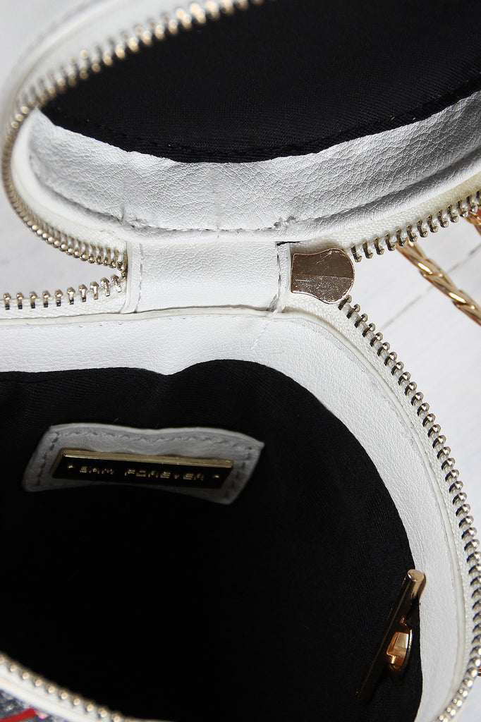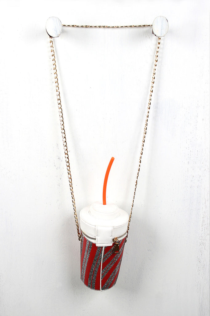 Description Quench your thirst for style with this novelty soda bag! Featuring colorful and metallic leatherette, zippered top, and flat curb link chain shoulder strap with 22"drop. Finished with full interior lining.