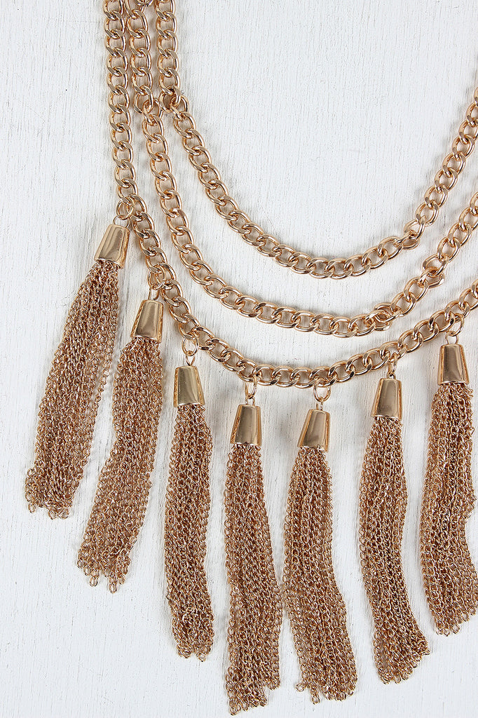 Description This necklace features three strands of glossy curb link chain, chain tassels, and adjustable lobster hook closure. Necklace includes matching earrings. Lead and nickel compliant.