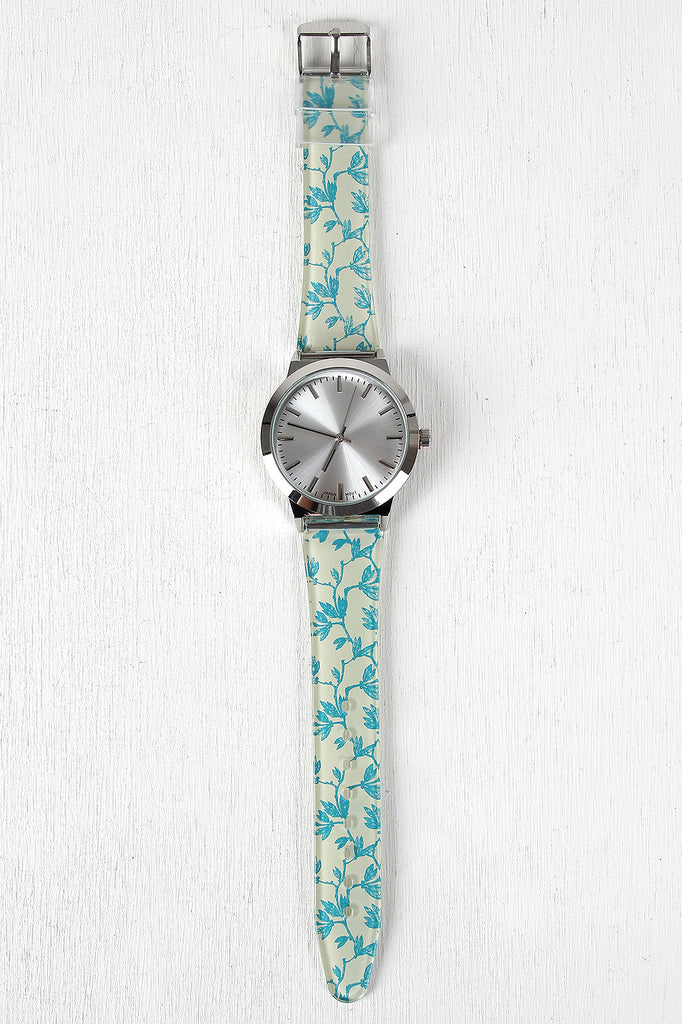 Watch with glossy round bezel, brushed metallic face with hour markers, and two-tone branch print band with adjustable buckle closure.