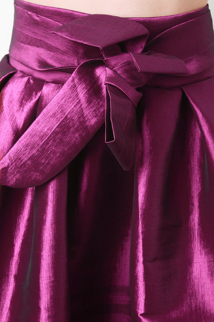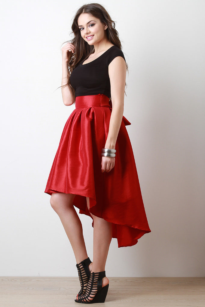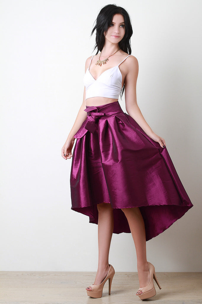 Description This gleaming high-low skirt is taffeta bodice with a fitted pleated waist. Designed with a hidden side zipper and a self-tie bow belt. Accessories sold separately. Made in U.S.A. 60% Polyester, 35% Nylon, 5% Spandex.