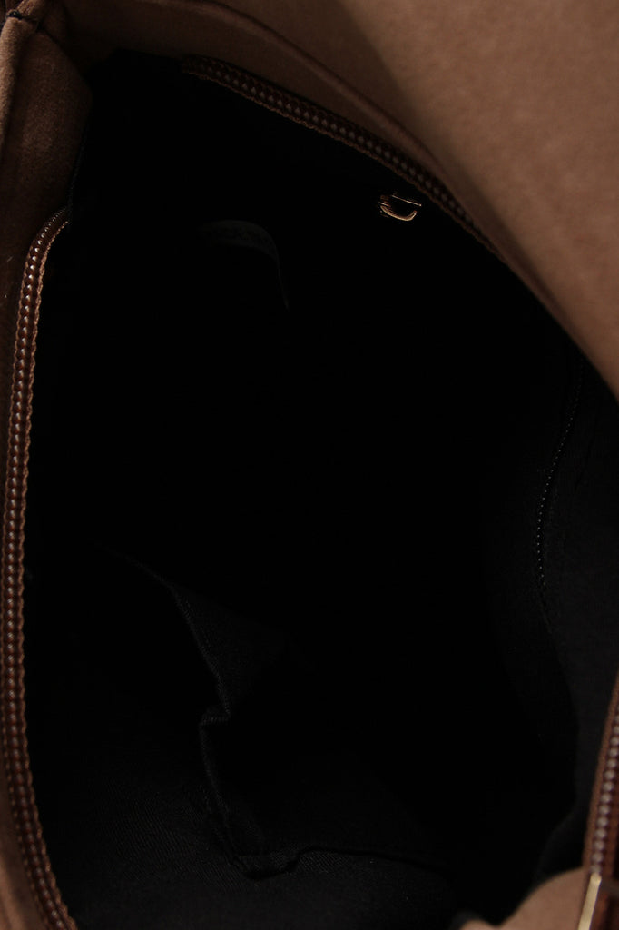 Description This rustic faux suede saddle fringe trim, and magnetic flap and zipper closure. The fully lined interior has one zipper pocket and one slip pocket. Shoulder strap has a sectioned design with rounded braid straps, threaded accents, and rolled fabric embellishments (21" drop).