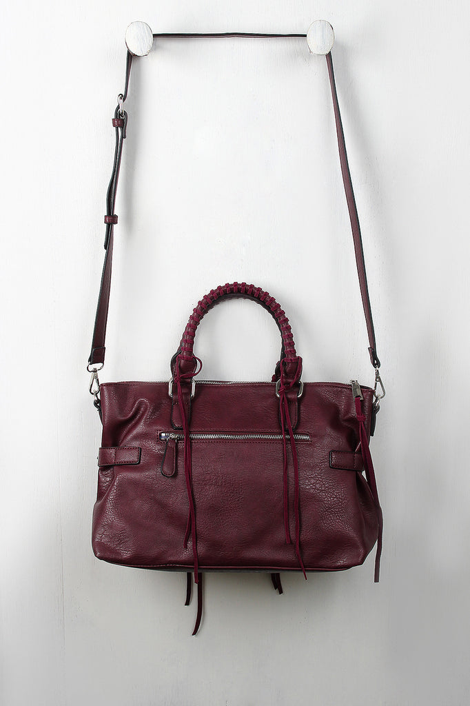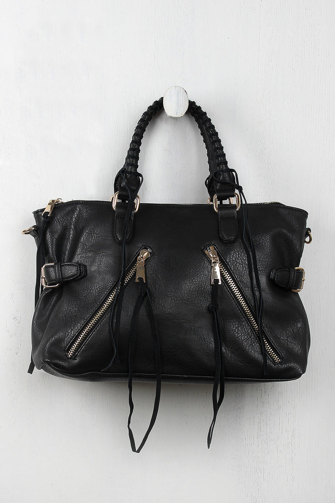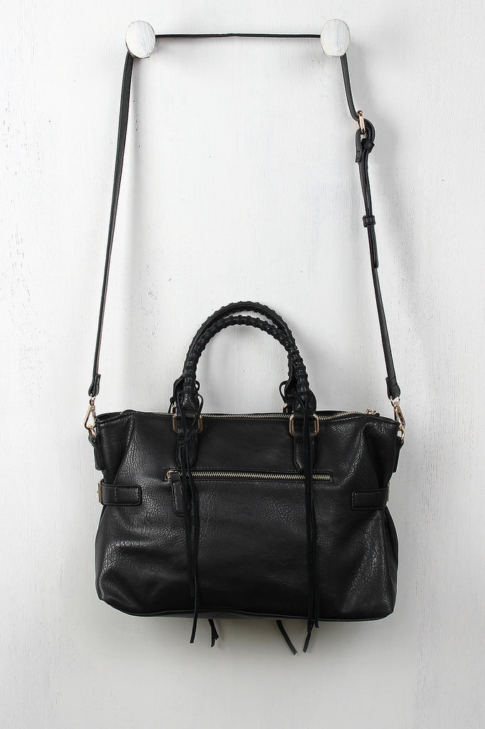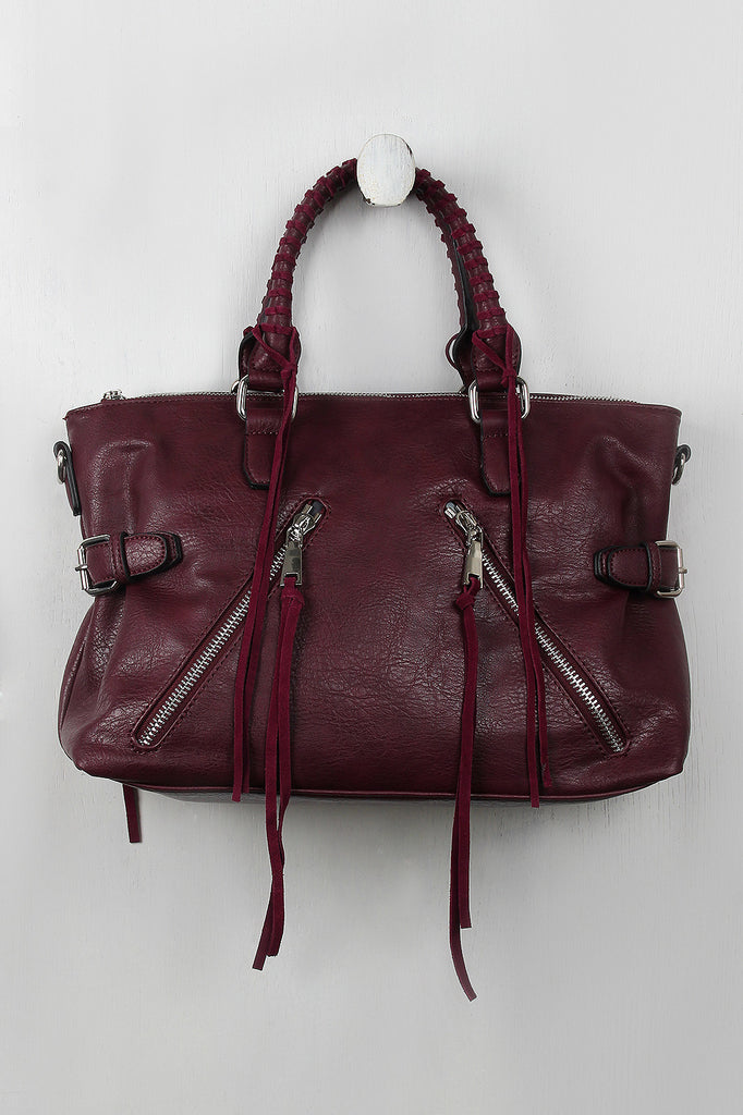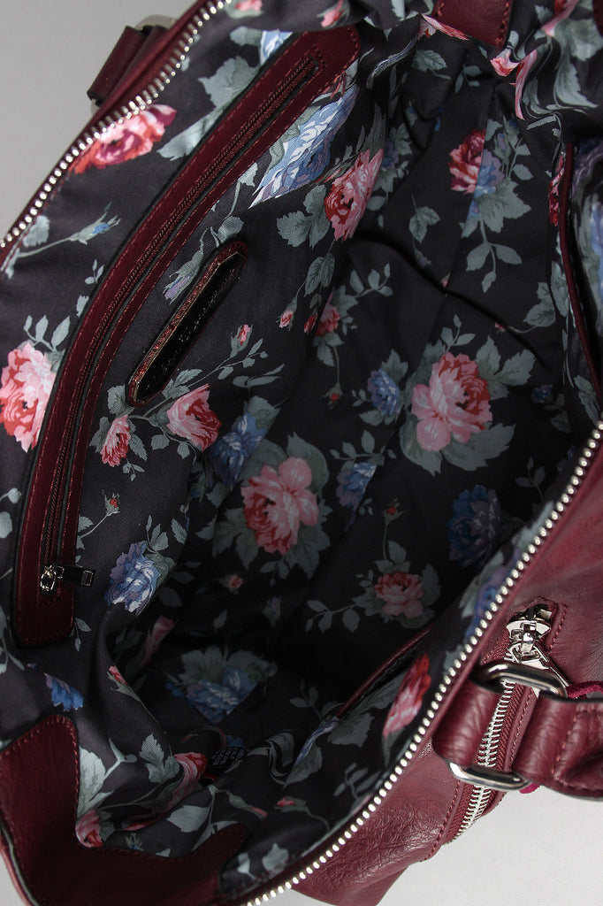 A soft vegan leather faux suede cord on the handles and zipper pulls. Handles have a 5.5" drop. The top closes with a metallic zipper, and the spacious interior is fully lined with colorful floral fabric. Includes one interior zipper pocket, two slip pockets, and one exterior zipper pocket at the back. Adjustable shoulder strap attaches with glossy lobster hooks at sides.