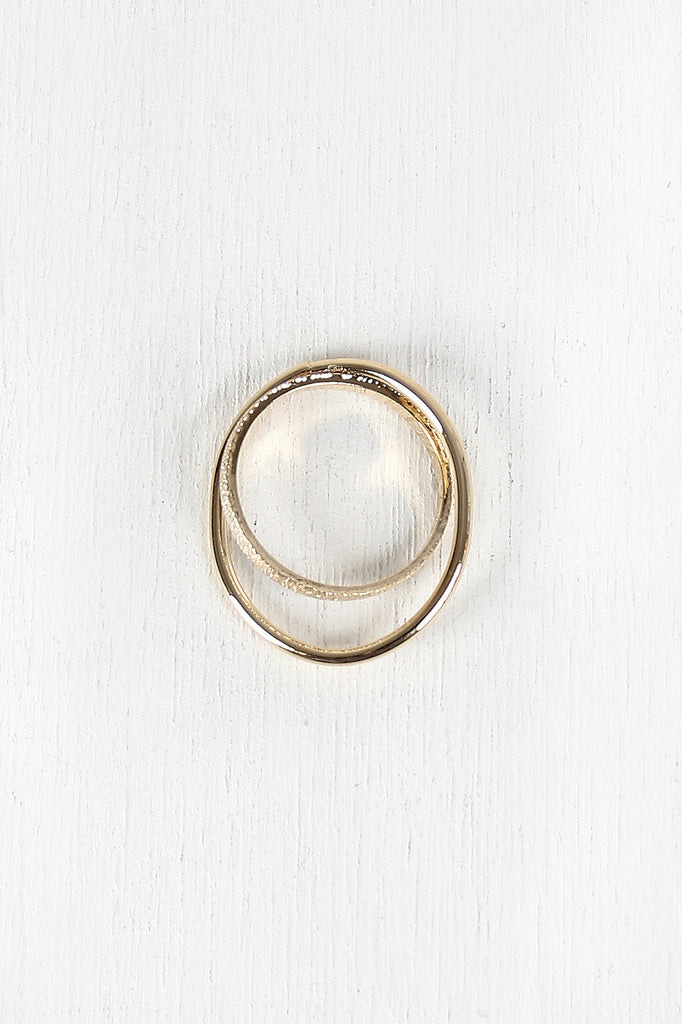 Ring features a glossy loop and a sanded-texture loop in a rolling rings design. Loops are attached at a fixed point and are non-adjustable.