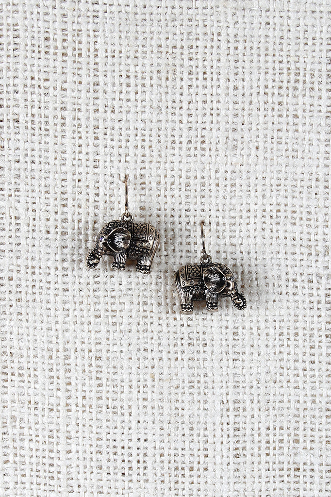 These 3D elephant earrings feature detailed etchings, an antique-finish, rhinestone eyes, and French hook backs.