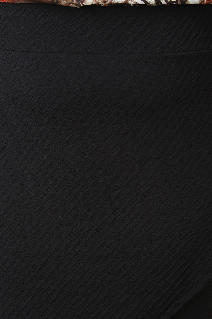This skirt features a texture knit fabrication, wide elasticized waist, envelope front tier, and stretchy sculpture fit. Accessories sold separately. Made in U.S.A. 95% Polyester, 5% Spandex.