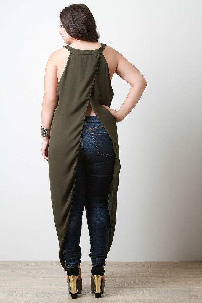 Description This plus size sleeveless maxi top features a round neckline and a semi-sheer chiffon in a front and back tulip split design. Unlined. Accessories sold separately. Made in U.S.A. 100% Polyester.