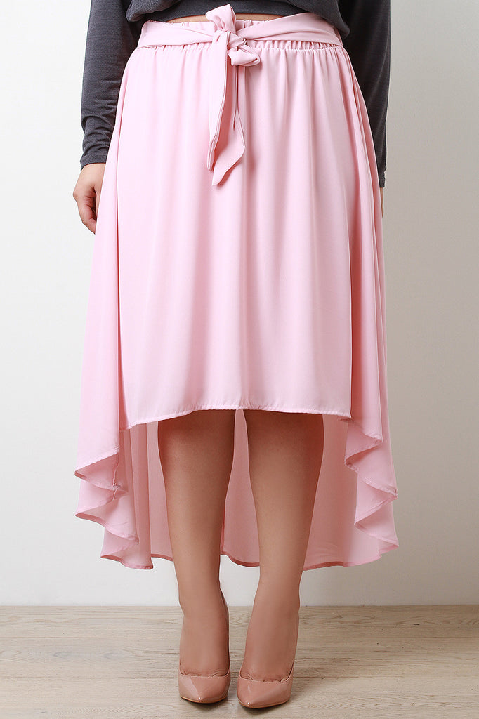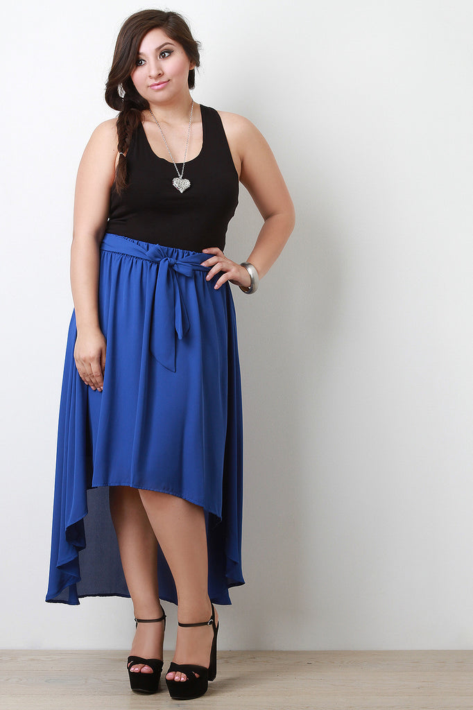 Description This plus size elasticized maxi skirt has a high-low hem, featuring a mini skirt lining. It is flowy construction with a self tie sash on the front. Accessories sold separately. Self: 100% Polyester. Lining: 100% Polyester.
