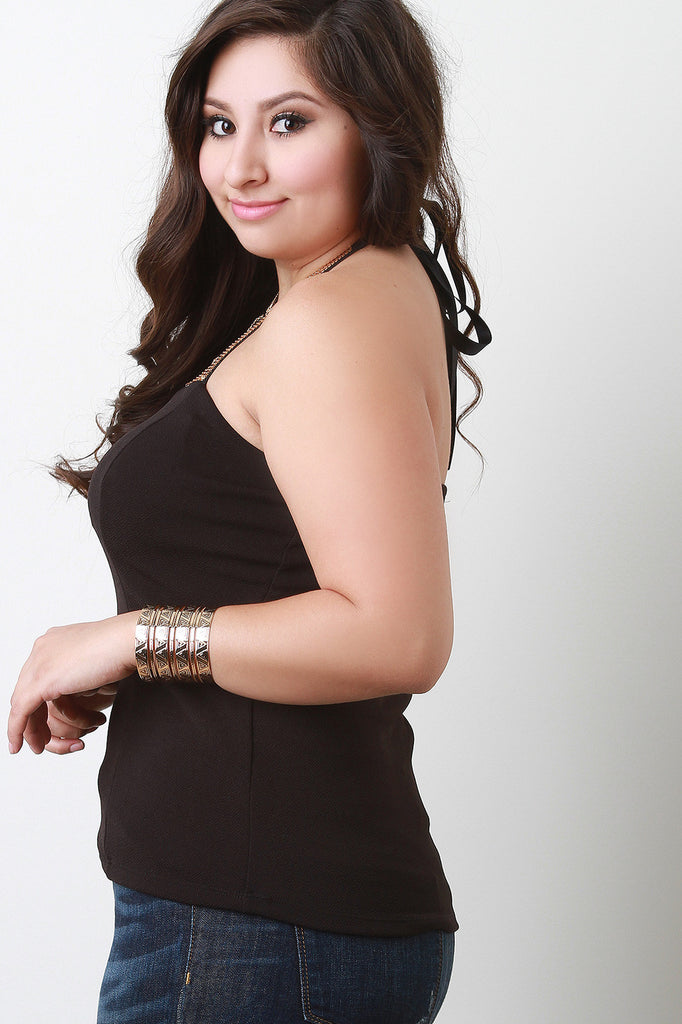 Description This chic plus size top features a caged yoke with gold-tone chain accent, self-tie halter neckline, sweetheart neckline with padded cups, princess seam front, texture knit fabrication, and partially lined. Accessories sold separately. Made in U.S.A. 95% Polyester, 5% Spandex.