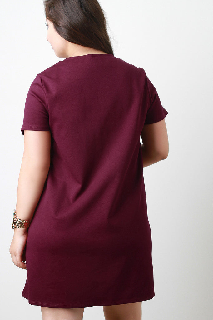 This plus size shift dress is t-shirt silhouette with its short sleeves and a scooped neckline. Its elegant touch is featured by the criss-crossing straps lace up look. Accessories sold separately. 65% Rayon. 30% Nylon. 5% Spandex.