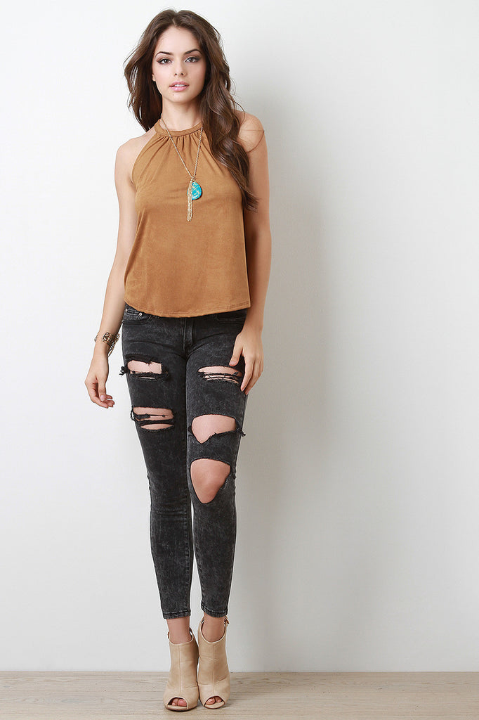 This faux top features a gathered round neckline and keyhole back. Accessories sold separately. Made in U.S.A. 93% Polyester, 7% Spandex.