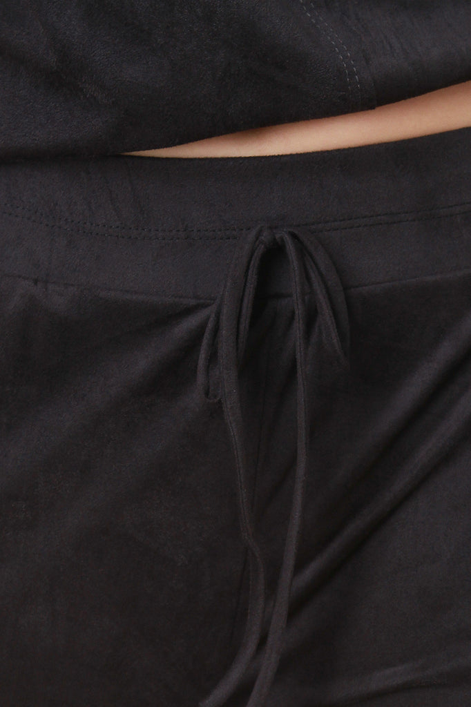 Soft vegan jogger pants with elasticized waistband, elastic cuffs, and side pockets. Finished with faux drawstring embellishment. Accessories sold separately. Made in U.S.A. 90% Rayon, 10% Spandex.