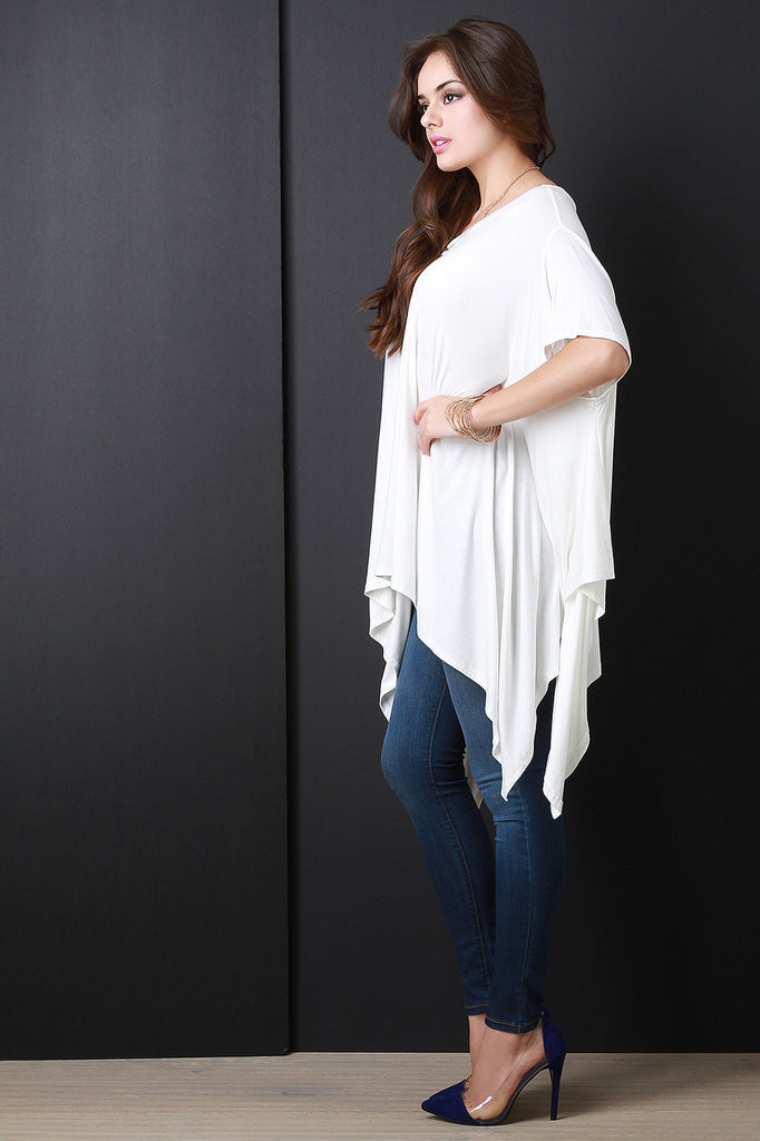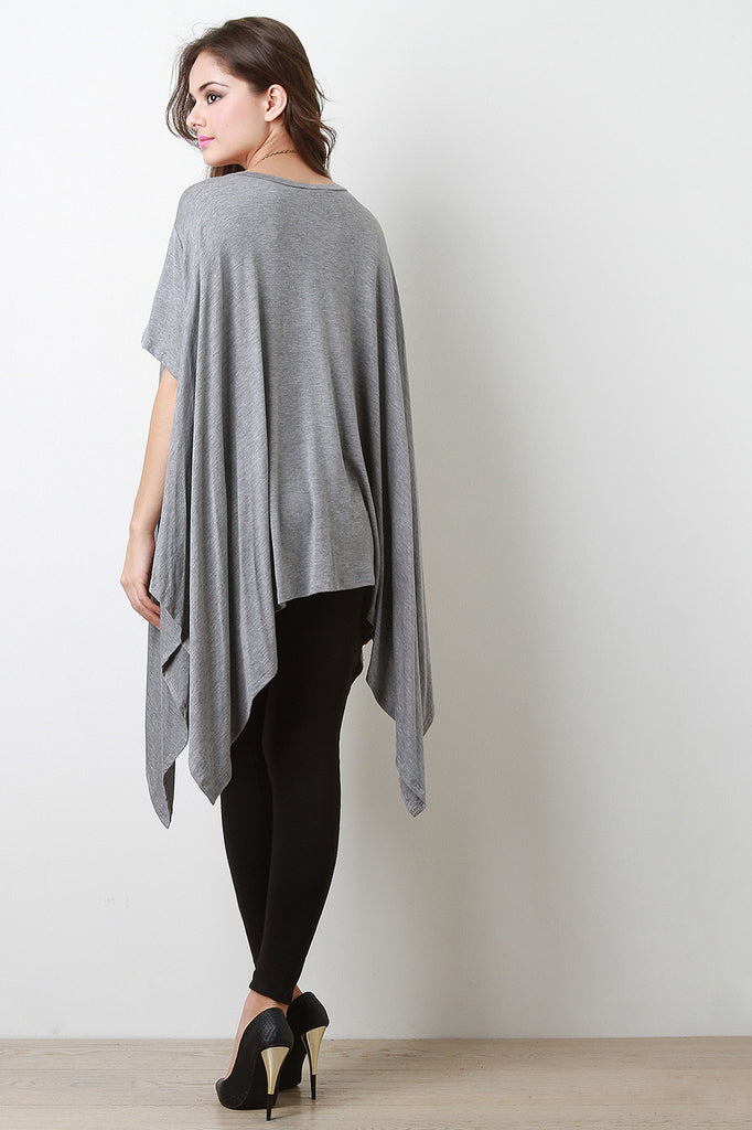 Description This boho trapeze top features jersey knit fabrication, round neckline, short sleeves, poncho inspired design with an asymmetrical hemline. Accessories sold separately. Made in U.S.A. 97% Rayon, 3% Spandex.