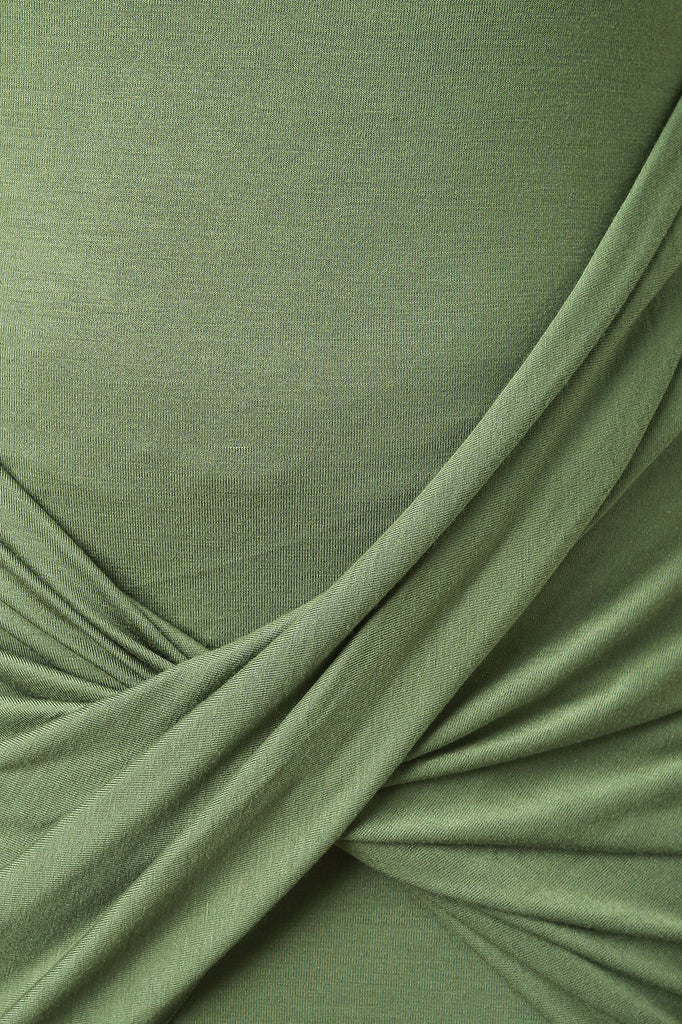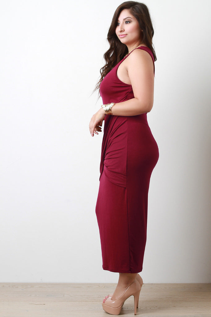 Description This chic plus size jersey knit maxi dress features a round neckline, sleeveless construction, and draped twisted front sash design. Accessories sold separately. Made in U.S.A. 95% Rayon, 5% Spandex.