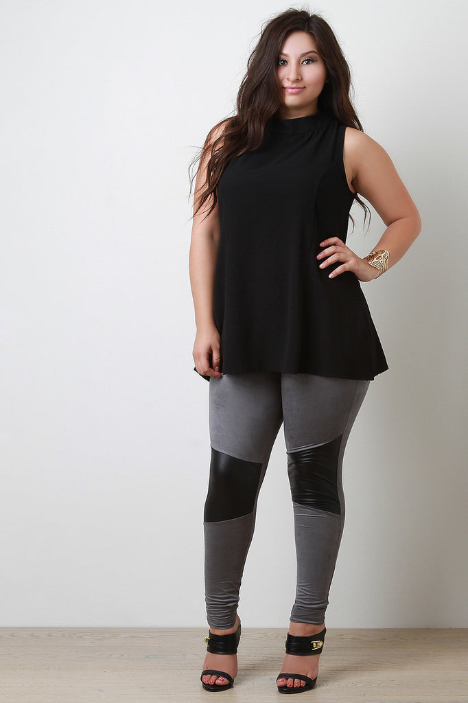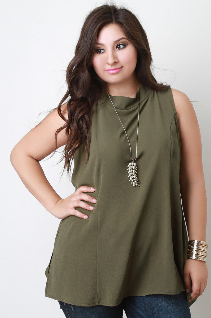Description This plus size chiffon top is trapeze silhouette with princess seams. Designed with a slight mock-neck and two button-and-loop closures on the back; featuring, a keyhole opening. Finished with two small side slits. Accessories sold separately. 100% Polyester.