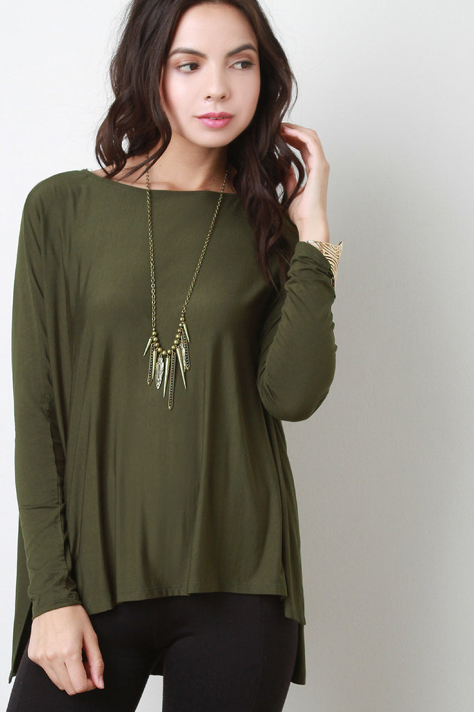 This top features soft stretch knit, round neckline, long sleeves, side slits, and high-low hemline. Accessories sold separately. 92% Rayon, 8% Spandex.