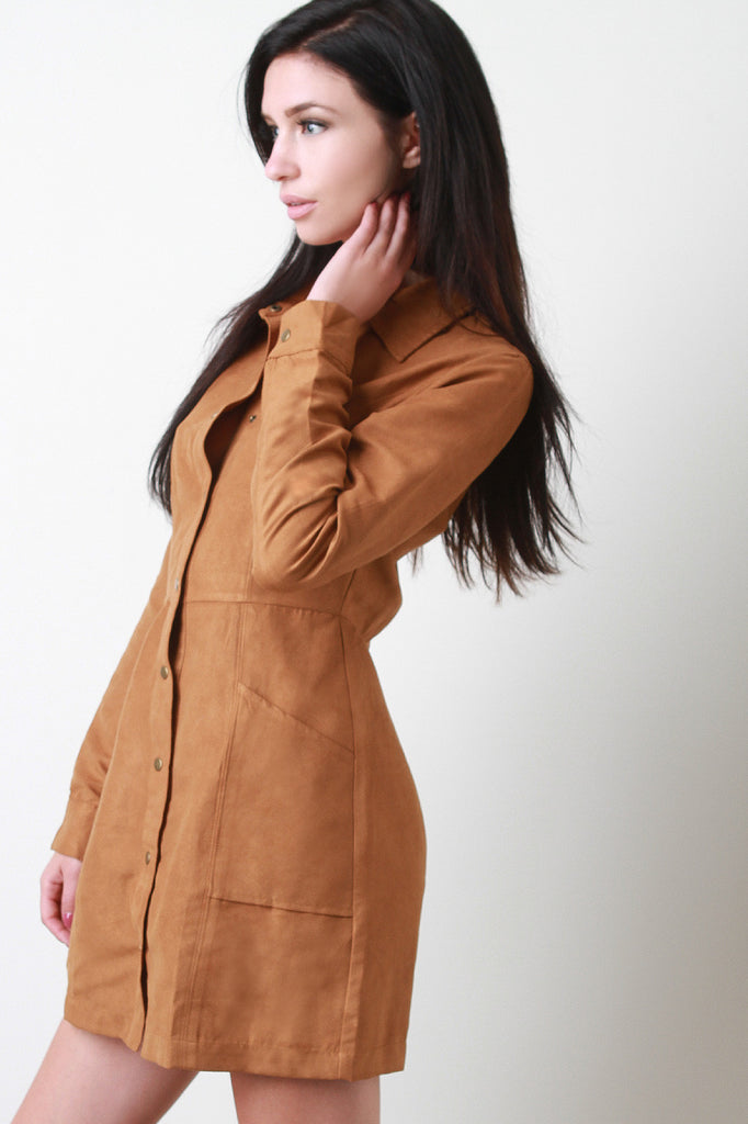 This microfiber vegan suede dress features snap button-up front to a classic collar neckline, long sleeves, princess seam, cinched waist seam, square side pockets, and fully lined. Accessories sold separately. 100% Polyester.