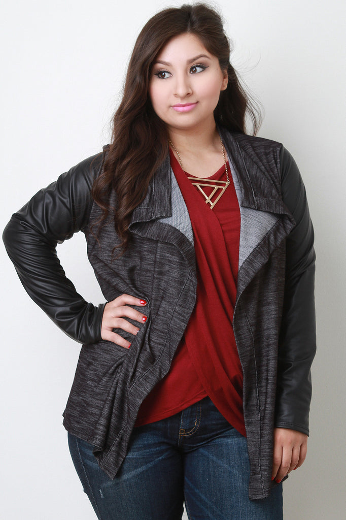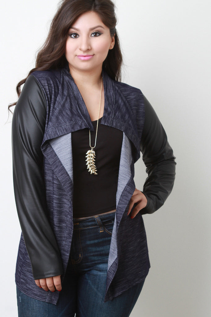 Description This trendy blazer features a sophisticated collar design, textured fabrication with contrasting long vegan leather sleeves, open front, and straight hemline. Accessories sold separately. Made in U.S.A. Self: 92% Cotton, 8% Spandex. Contrast: 100% Polyester.