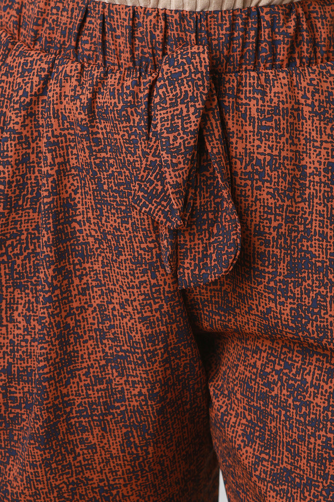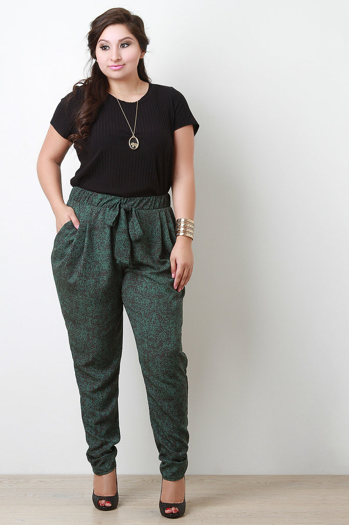 Description Plus size patterned pants with an elasticized waist, side pockets, and tapered relaxed fit. Finished with self-tie bow at front. Accessories sold separately. Made in U.S.A. 100% Polyester.