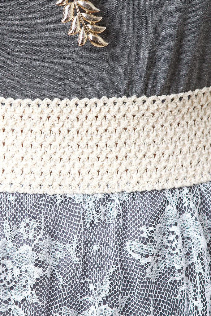 Description This chic dress features a knee length design, round neckline, short sleeves, wide elasticized cinched waistband, and a semi-sheer floral lace maxi overlay construction. Accessories sold separately. Made in U.S.A. 70% Rayon, 27% Polyester, 3% Spandex.