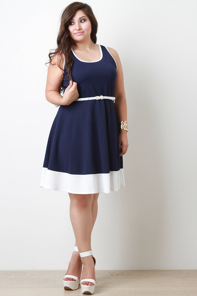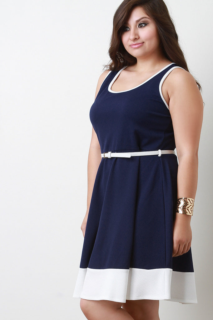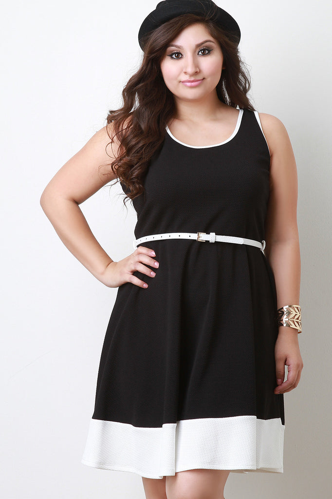 Description This gorgeous plus size skater dress features a round neckline, sleeveless design, contrasting panels trim, and teardrop cutout detail with button closure. Finished with thin vegan leather belt with adjustable buckle fastening. Accessories sold separately. Made in U.S.A. 95% Polyester, 5% Spandex.