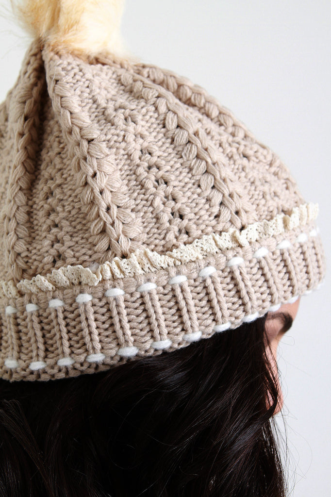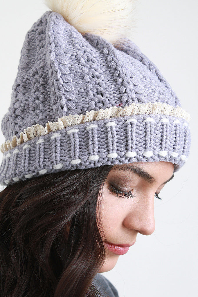 This cozy and cute ridged knit beanie features a faux fur pom pom, wooden button accent, and crochet lace trim. One size fits most. 95% Acrylic, 5% Polyester.