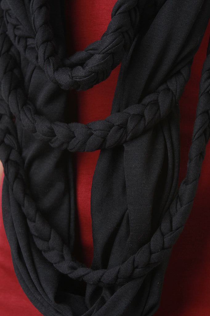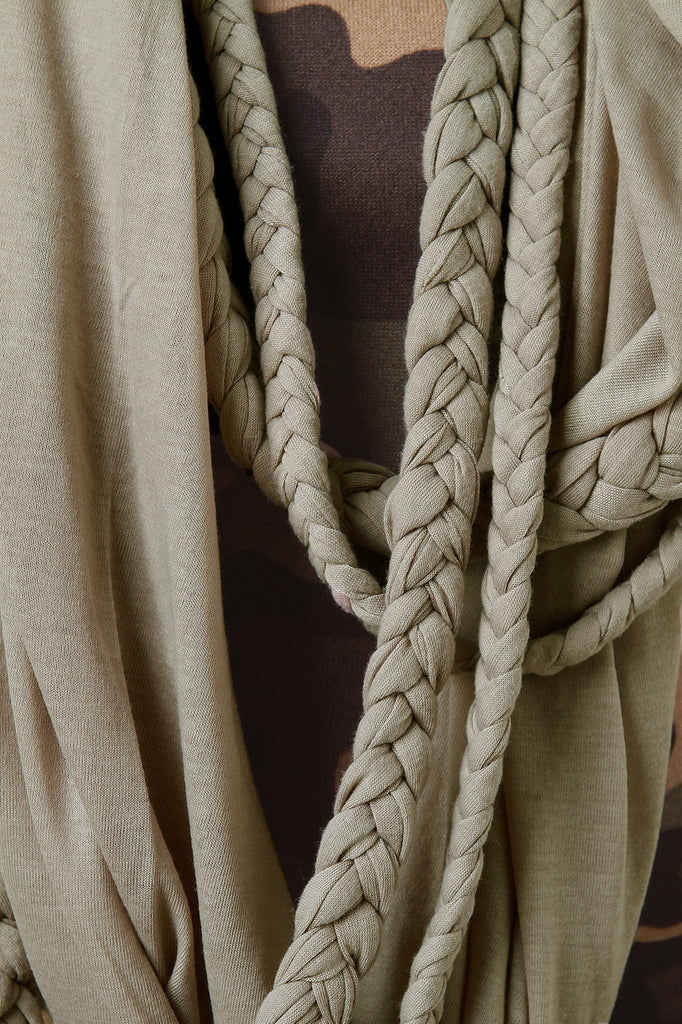 This unique infinity scarf features soft jersey knit and two long braided rope embellishments. 100% Polyester.