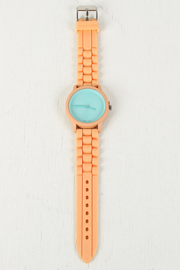 This two tone watch features a round rubber bezel, four hour markers, with a rubber faux link strap. Finished with two keepers and adjustable buckle closure.
