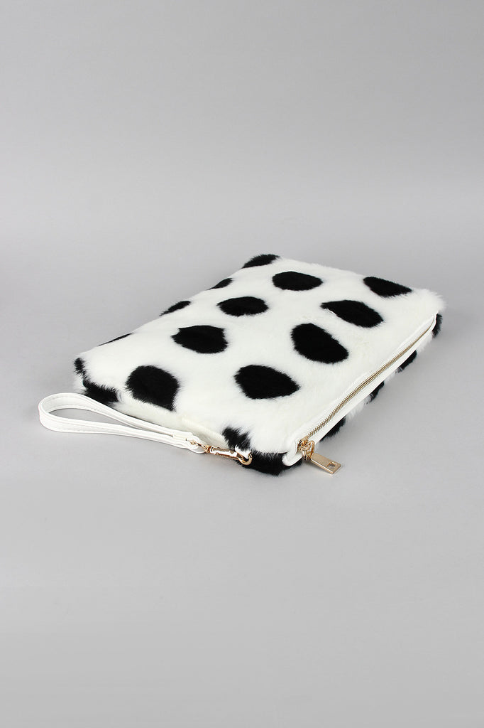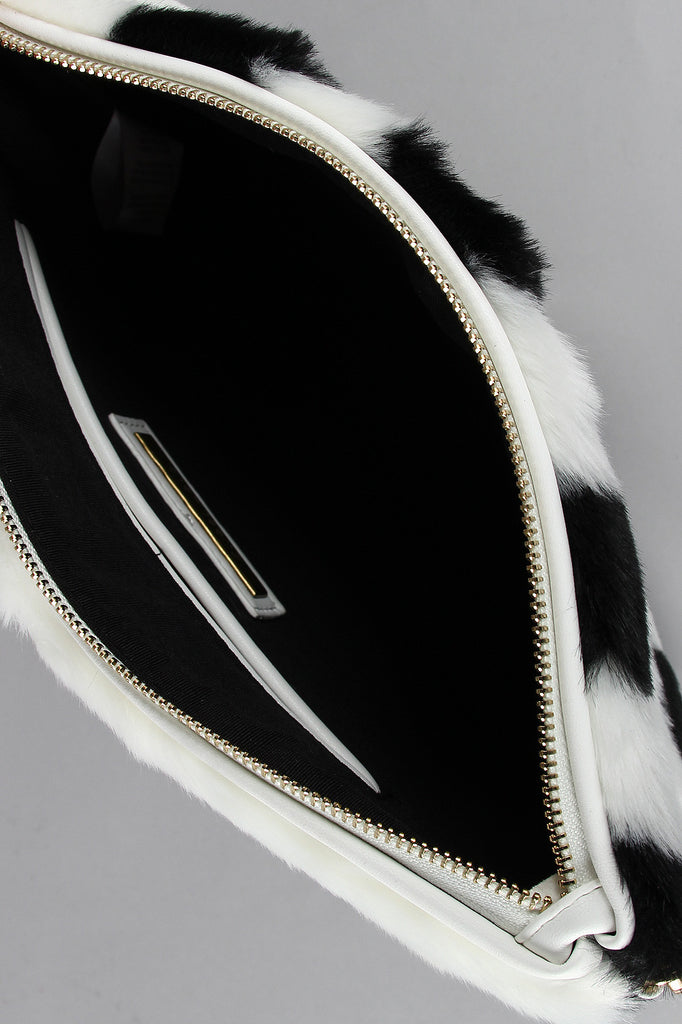 This faux fur clutch features a two-tone design, gold-tone metallic zipper, and full interior lining with one slip pocket. Finished with matching detachable clutch strap (8" drop).