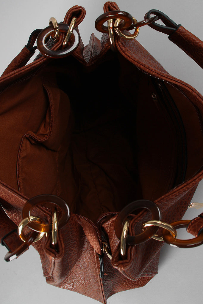 Take everything with you in this large bag featuring pebbled faux leather, gold-tone and tassel embellishment, and two top handles attached with resin and glossy enamel links (7" drop). The main compartment has a zipper closure, spacious interior, and full lining with three slip pockets and two zipper pockets. Finished with zipper pocket at the back.