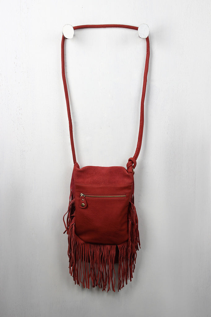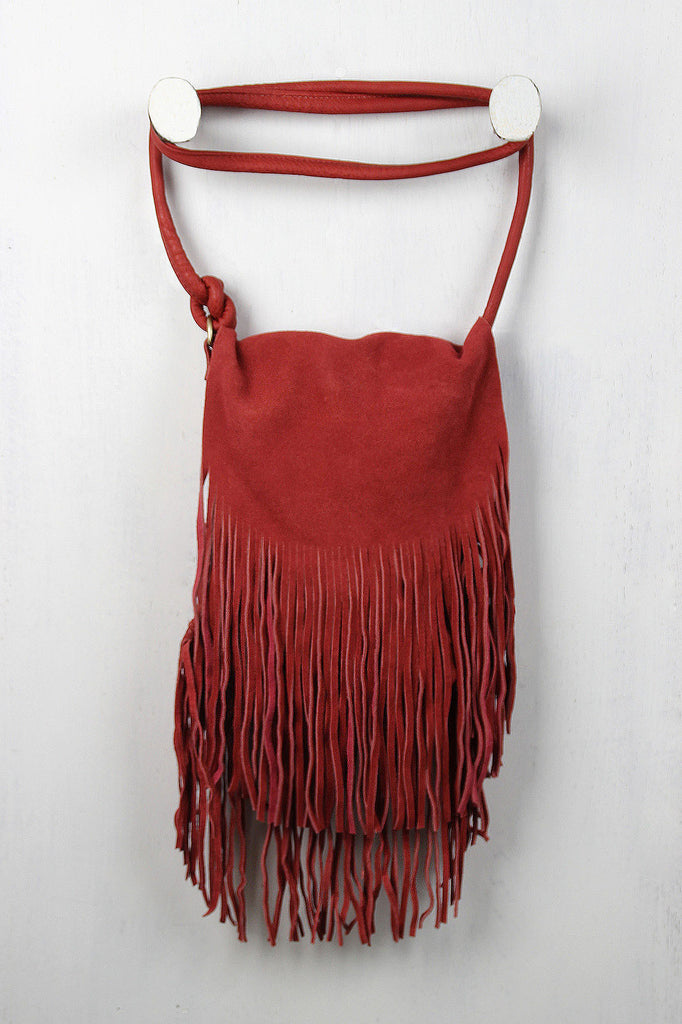 Description A shoulder bag featuring a faux suede flap with fringe trim, vegan leather body, and round shoulder strap with knotted accent. Finished with a magnetic strap closure, striped interior lining with one slip pocket, and one exterior zipper pocket at the back.