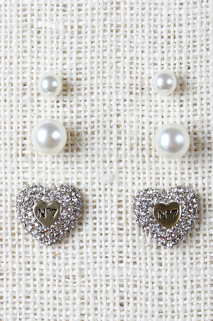 Description This set of three pairs of earrings features rhinestone-encrusted hearts stamped with "No7" and two sizes of faux pearl ball studs on post backs.