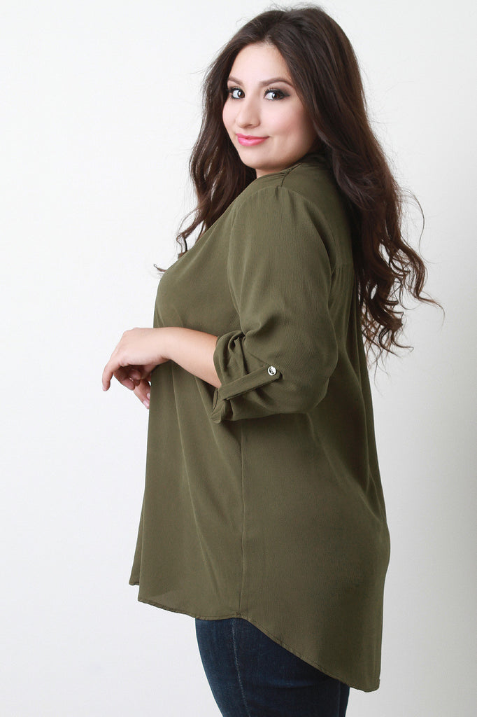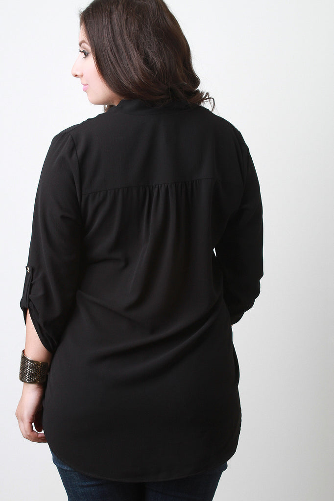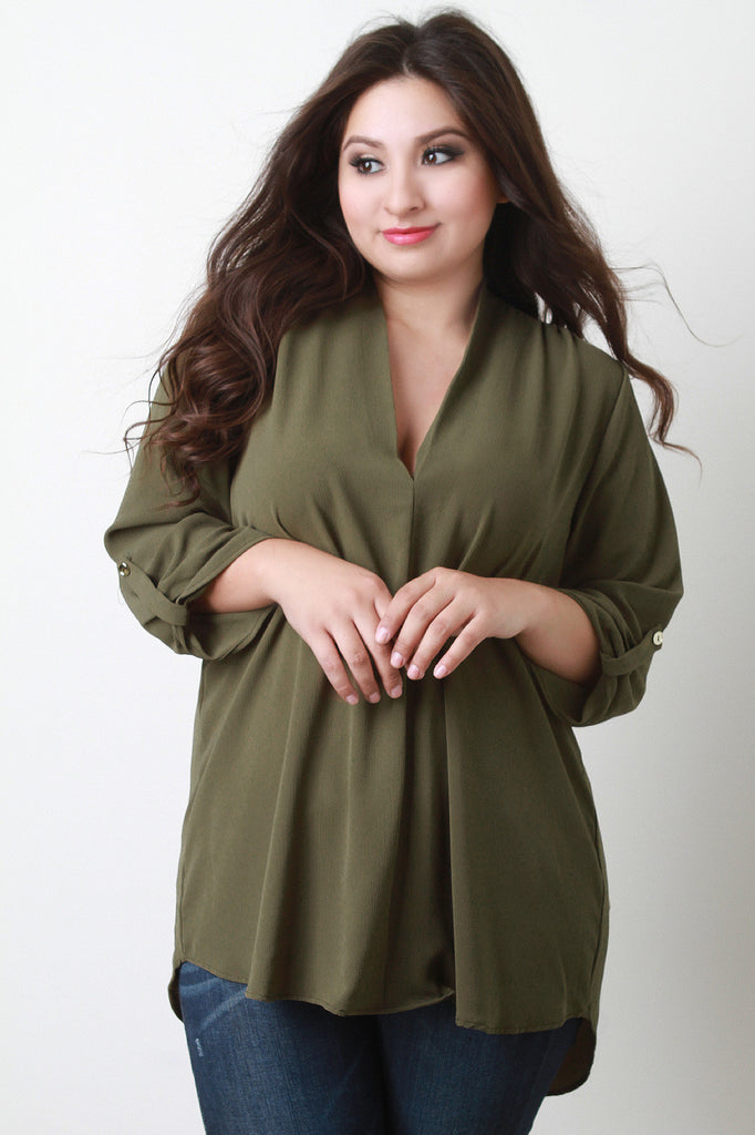 This plus size chiffon top is oversize flowly silhouette. It is v-neck quarter sleeves bodice; buttons are for decor. Accessories sold separately. 100% Polyester.