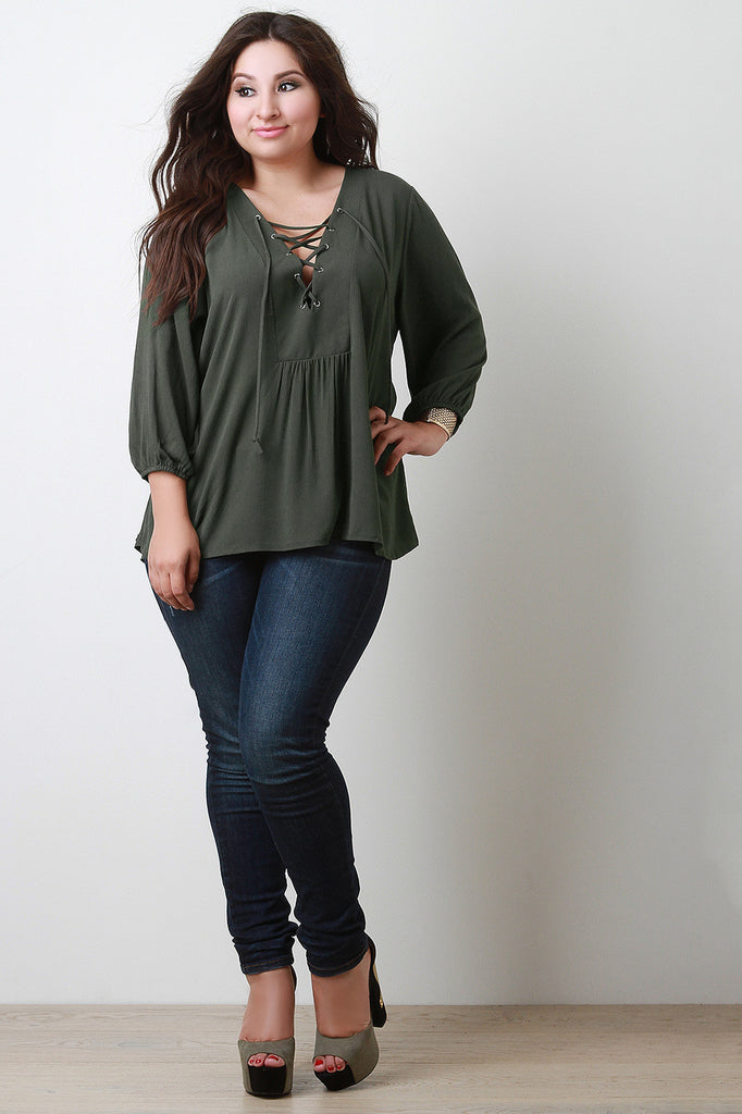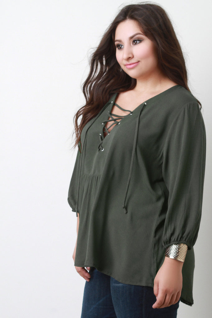 Description This plus size top is tunic silhouette with three-quarter sleeves and high-low hemline; featuring elasticized armholes. Designed with a plunging v-neckline with lace up straps through grommets. Accessories sold separately. 100% Rayon.