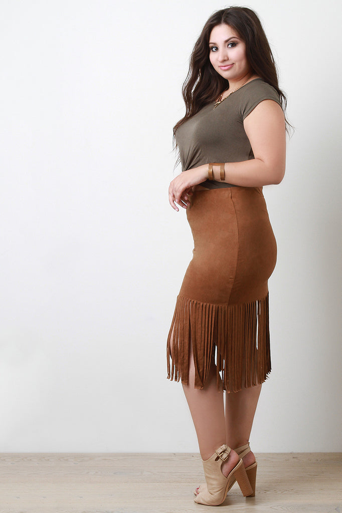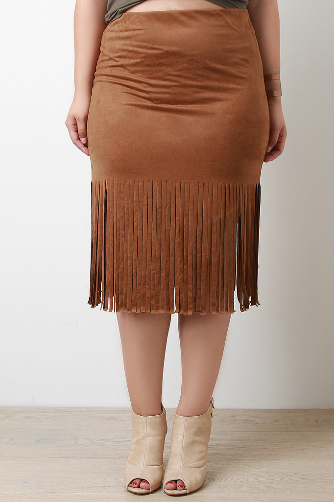 Description This plus size skirt is is vegan suede structure with fringe slits as the hemline. Designed with an elastic band. Accessories sold separately. 90% Microfiber. 10% Spandex.