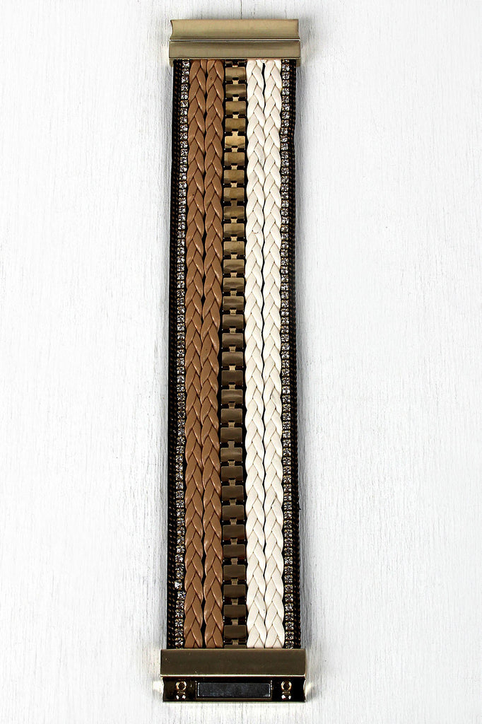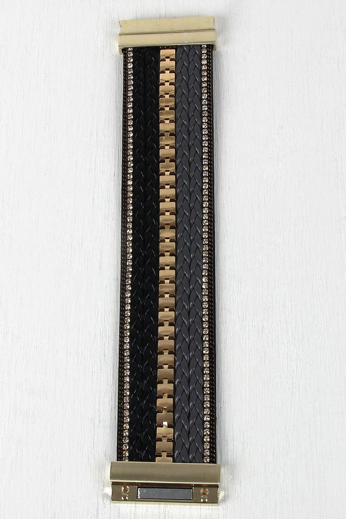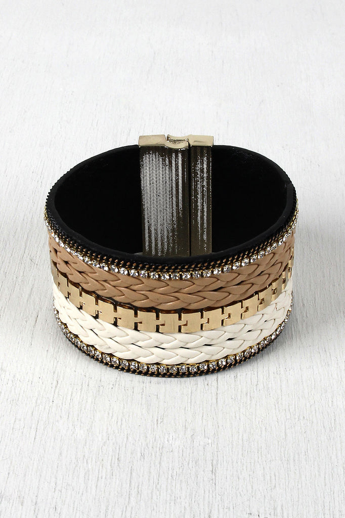 This cuff bracelet features a striped front design of braided vegan leather, glossy chain, and rhinestone chain. Finished with magnetic closure.