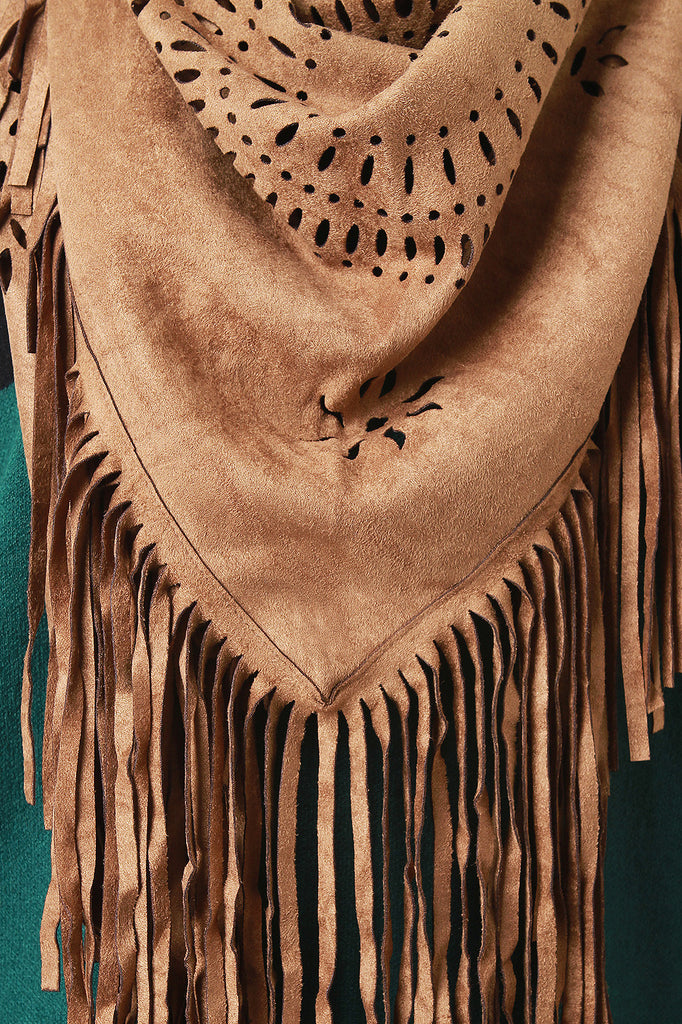 A soft faux scarf featuring a triangular shape, laser-cut medallion pattern throughout, and long fringe trim. 100% Polyester.
