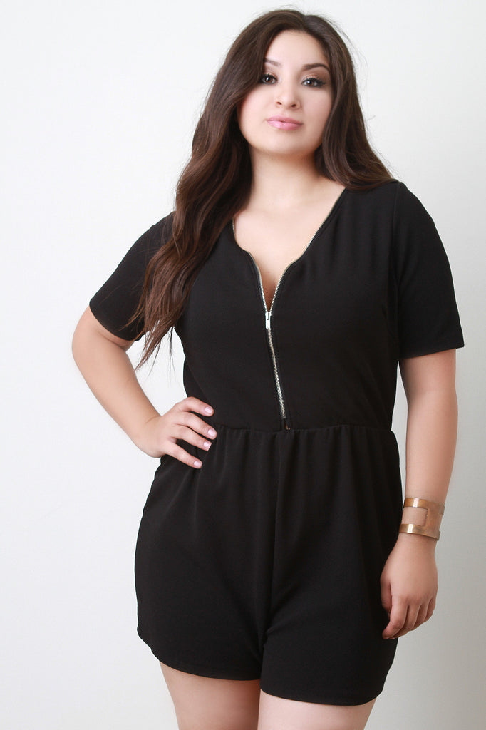 Description This plus size romper features textured knit, deep v-neckline, zipper decor at front and back, short sleeves, and elasticized waist. Accessories sold separately. Made in U.S.A. Self: 95% Polyester, 5% Spandex. Contrast: 100% Polyester.