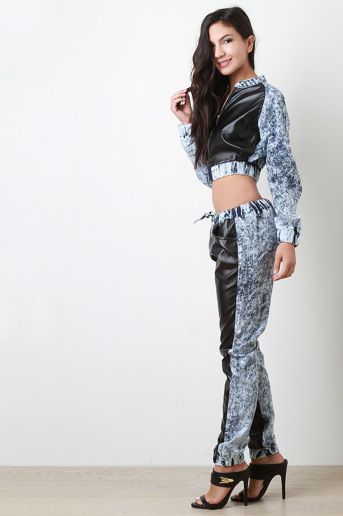 Description This cropped jacket was designed with an acid wash effect and two front vegan leather panels. Lightweight structure. Features full front zipper and elasticized arm openings and hemline. Accessories sold separately. 75% Cotton. 22% Polyester. 3% Spandex.