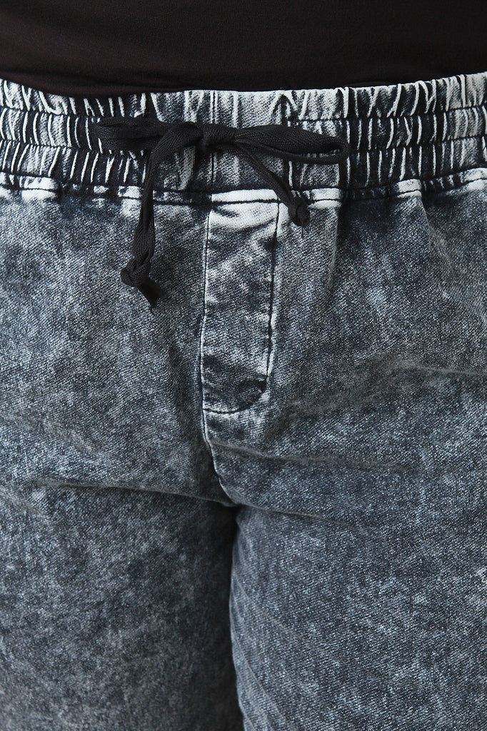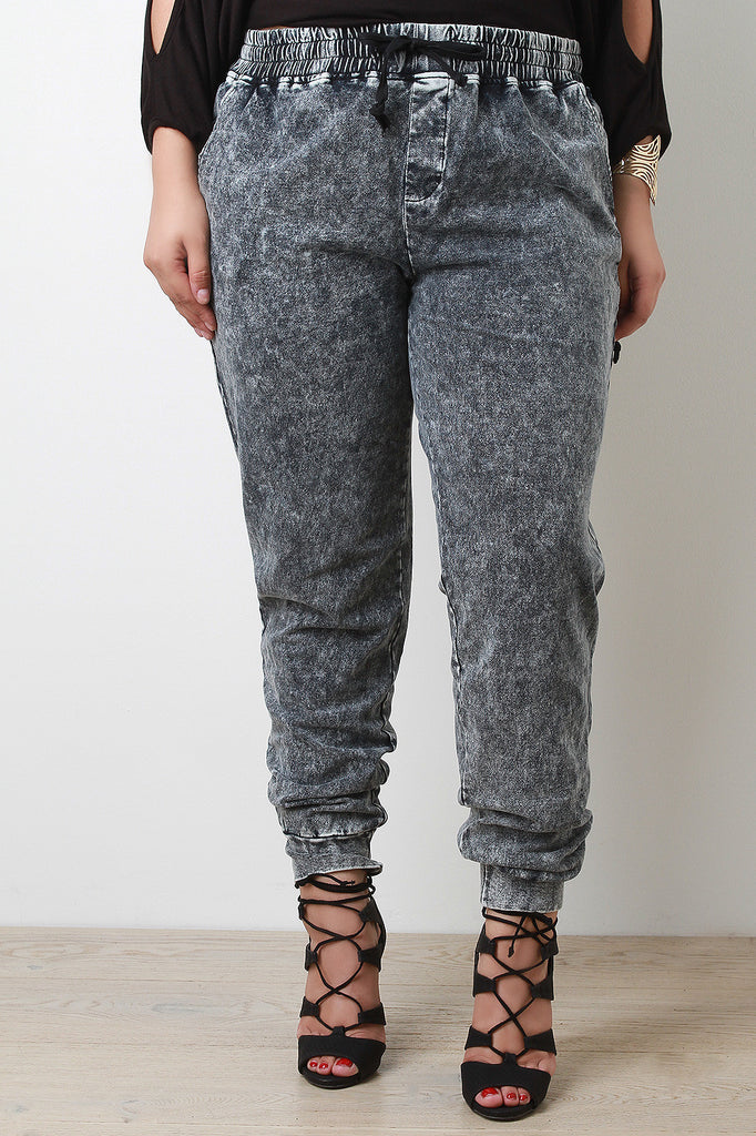 These plus size joggers pants feature washed denim, ruched elastic waistband with self-tie bow, and cuffed legs. Accessories sold separately. 96% Cotton, 4% Spandex.