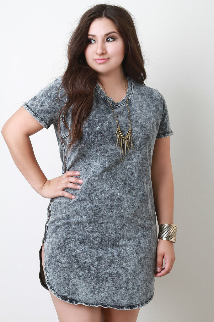 Description This plus size t-shirt dress features a washed denim, round crew neck, and short sleeves. Finished with a curved hemline, high side slits, and a functional side zipper embellishment. Accessories sold separately. 96% Cotton, 4% Spandex.
