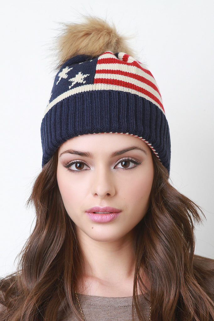 This beanie features the stars and stripes design, ribbed turned up brim, and a large faux fur pom pom. 100% Acrylic.