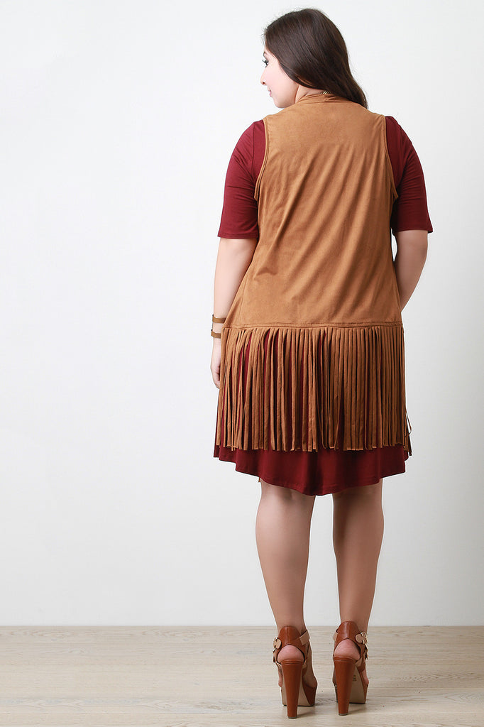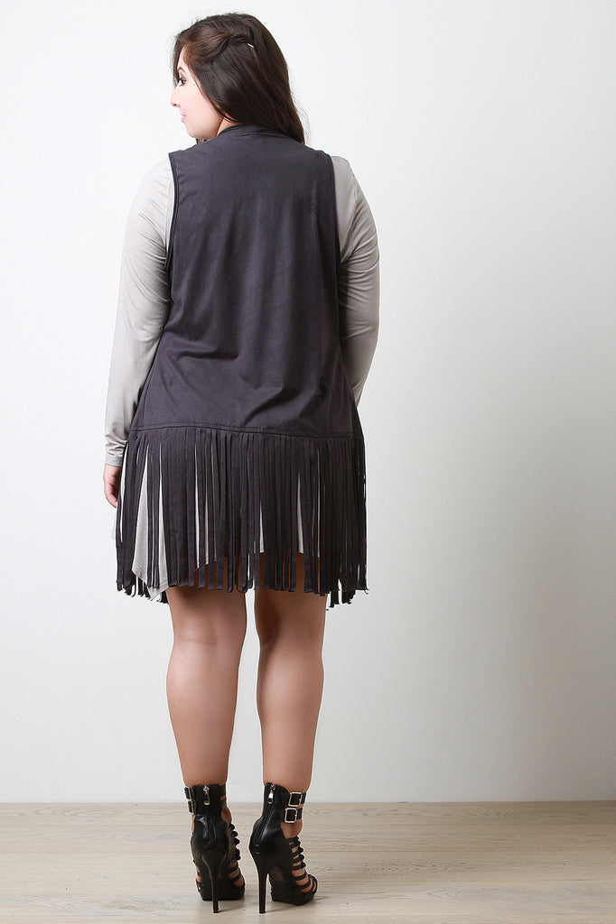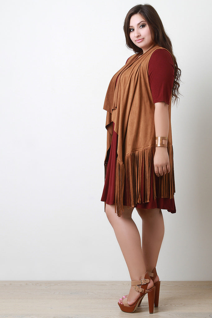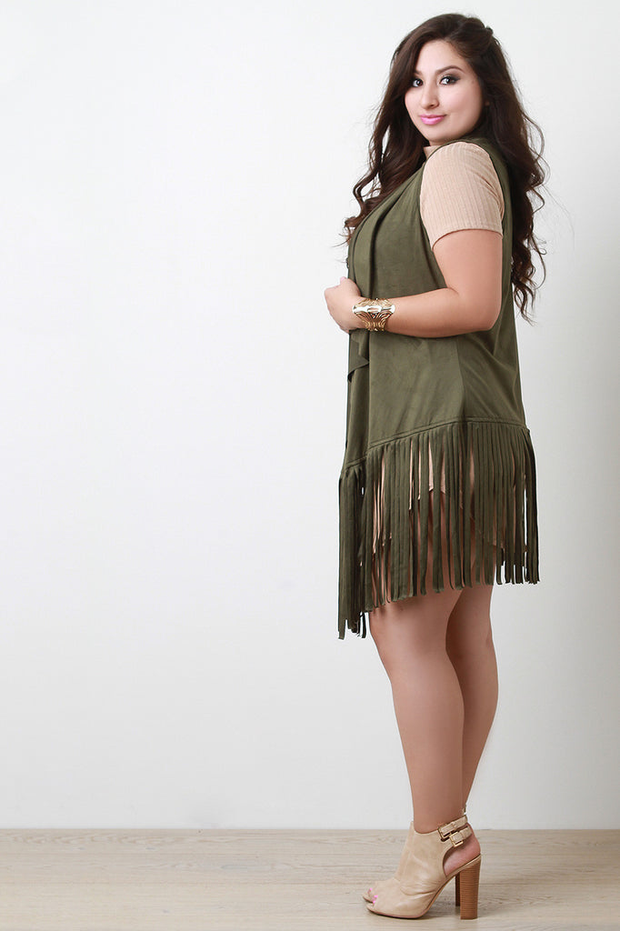 A plus size vest featuring faux suede, a draping raw-edged open front, and a fringe-trimmed hemline. Accessories sold separately. Made in U.S.A. 90% Microfiber, 10% Spandex.