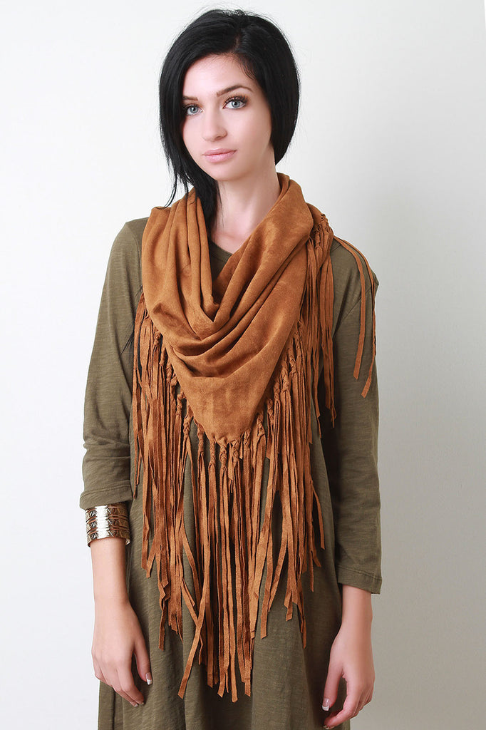 A soft faux scarf featuring a triangular shape and braided design fringe trim. 100% Polyester.