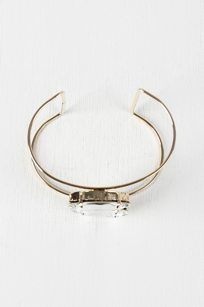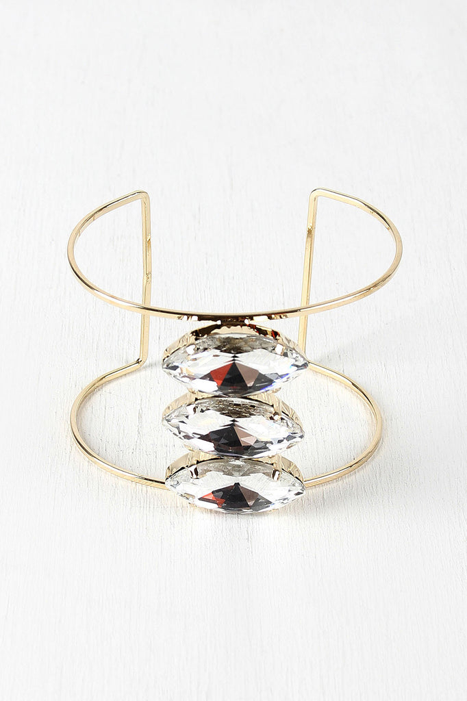 This cuff bracelet features a thin gold-tone frame and three oversize marquise-cut rhinestones.