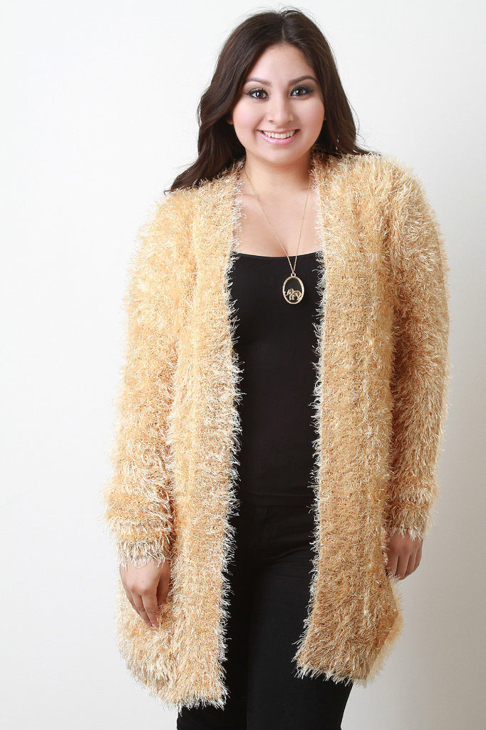 This plush plus size cardigan features fuzzy texture fabrication, open front, long sleeves, and front pockets. Accessories sold separately. 100% Polyester.